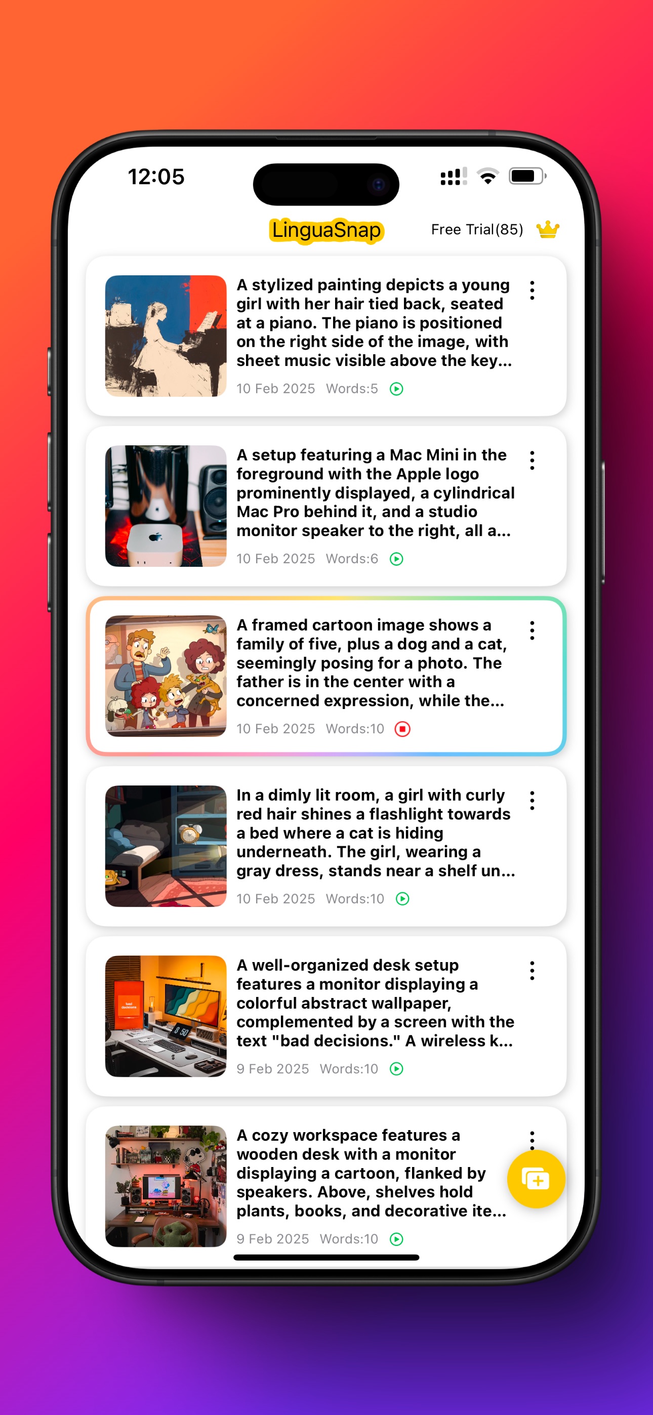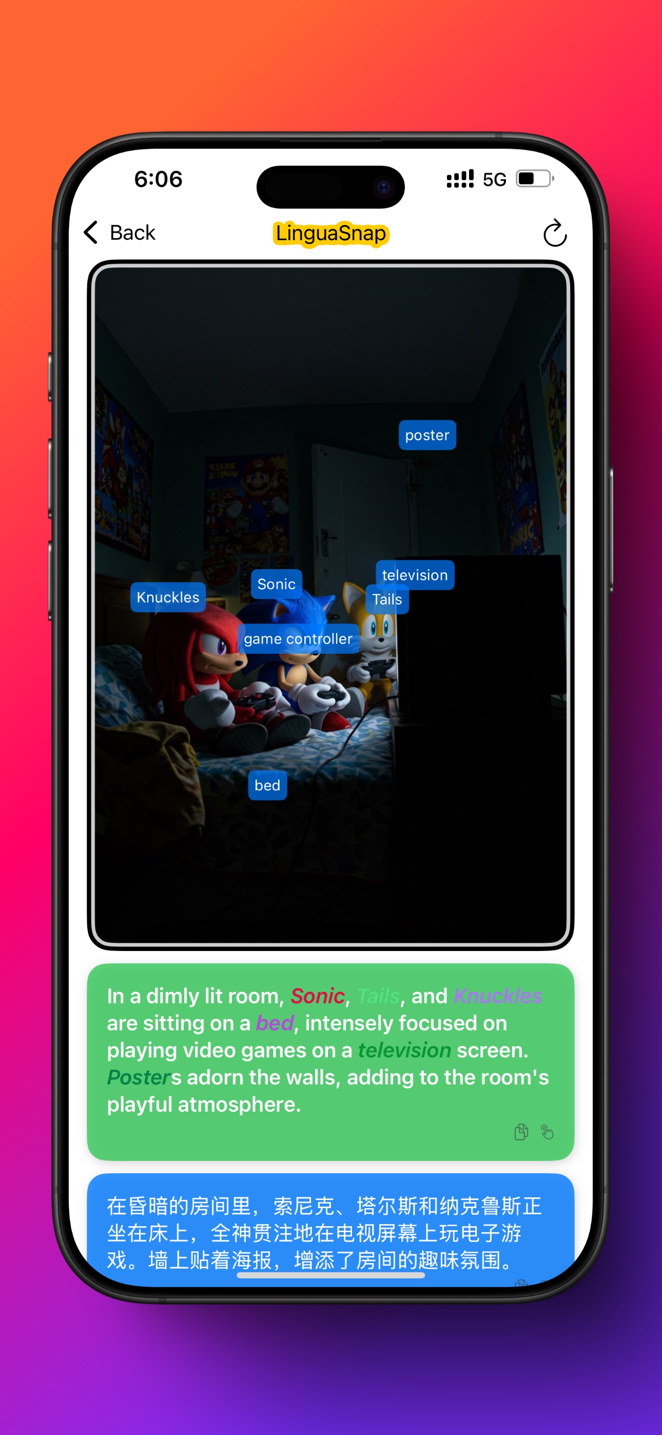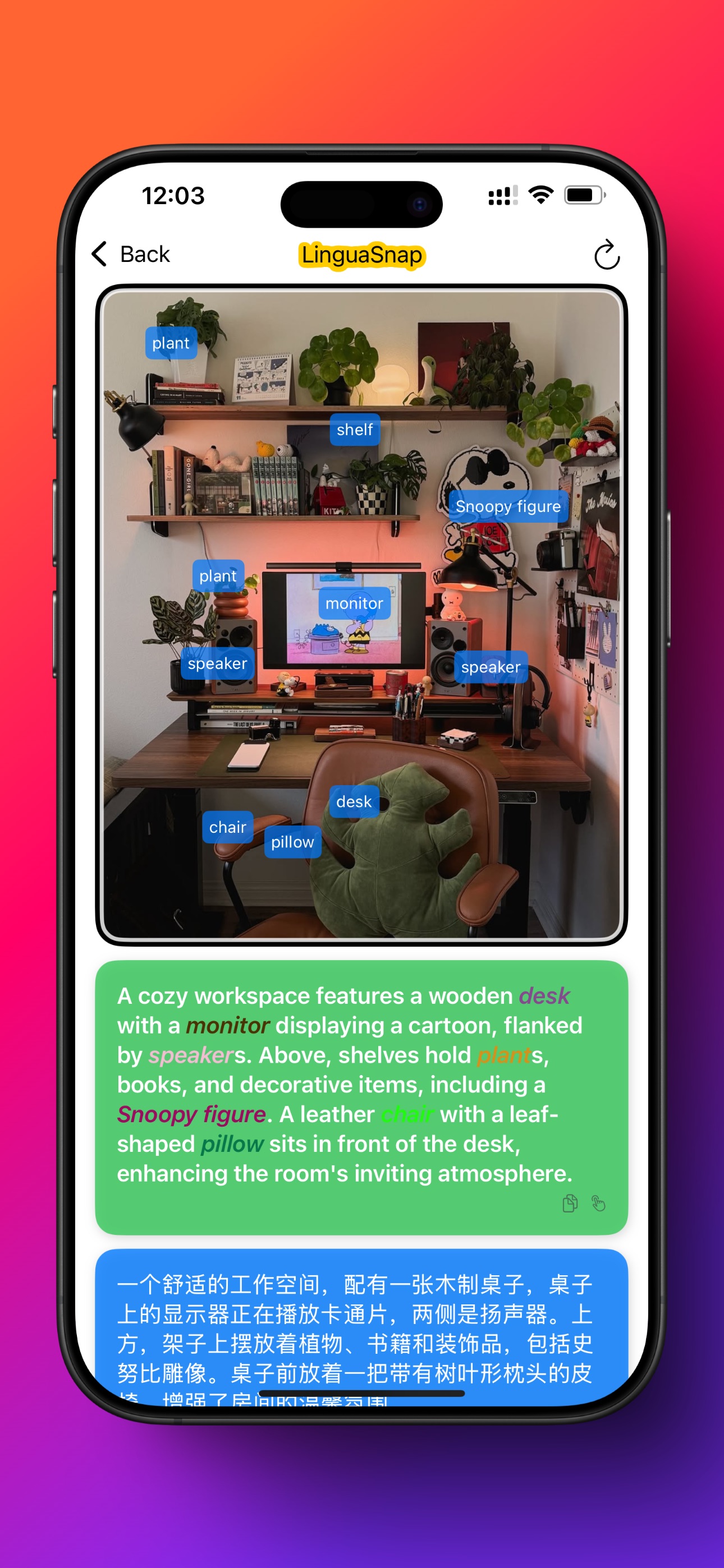 LinguaSnap uses advanced image recognition to help you learn languages through your surroundings. Capture any object, and instantly learn new vocabulary with natural voice pronunciation.